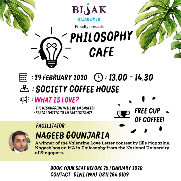 PURWOKERTO – Yayasan BIJAK (Bringing Improved Judgement and Knowledge) Pendidikan Filosofi, Jakarta menggelar diskusi interaktif Philosophy Cafe bertema “What Is Love?” di Society Coffee House Purwokerto, Sabtu (29/2) pada pukul 13.00-14.30. Diskusi berbahasa Inggris ini menghadirkan fasilitator Nageeb Gounjaria, seorang Master of Arts in Philosophy di National University of Singapore.